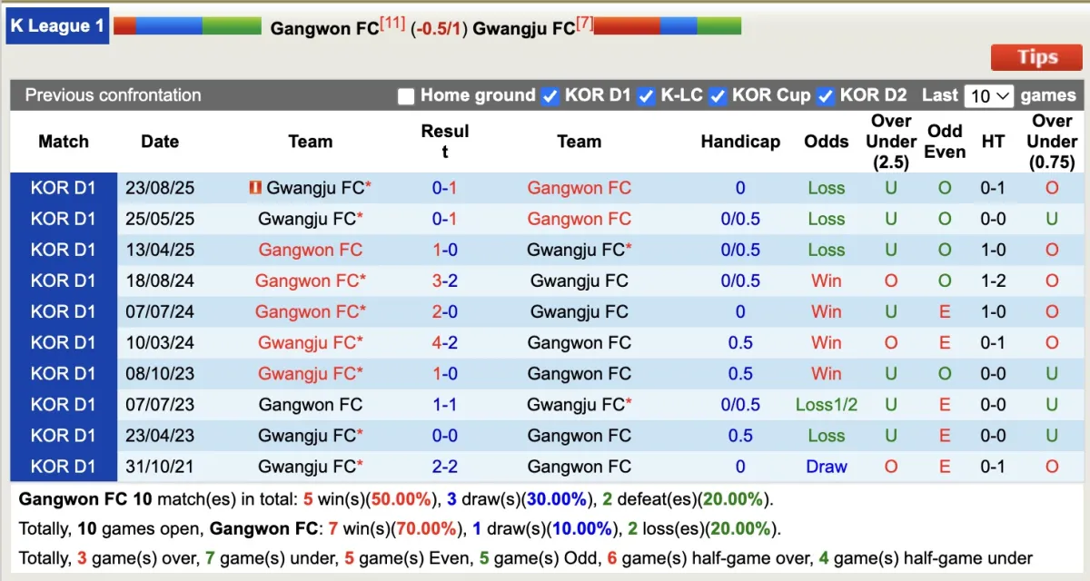 Gangwon đang được nhà cái đánh giá cao hơn trong trận đấu này, nhưng 8/9 trận gần đây, đội bóng này đã khiến các nhà đầu tư thất vọng khi không vượt qua được tỷ lệ Handicap. Trong khi đó, 7/8 trận gần đây của Gwangju đều thắng kèo, cho thấy chủ nhà có thể không đáng tin cậy ở kèo châu Á.