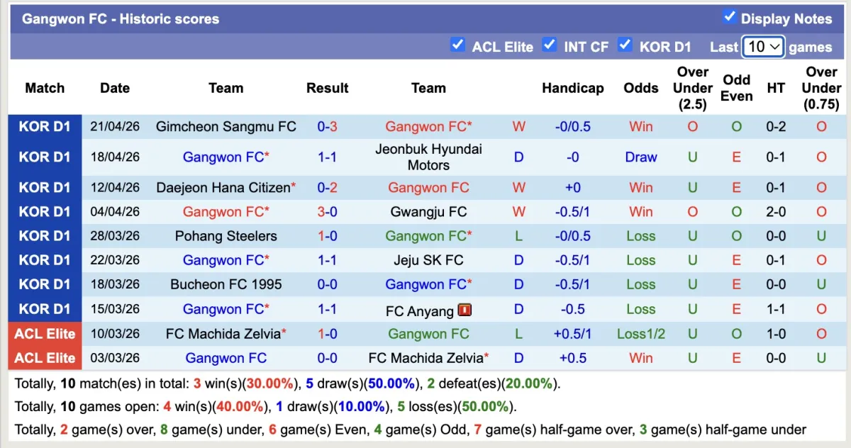 – Thống kê phong độ 10 trận đấu gần nhất của Gangwon