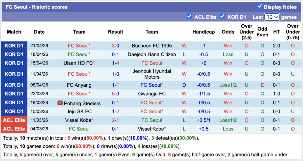 – Thống kê phong độ 10 trận đấu gần nhất của Seoul