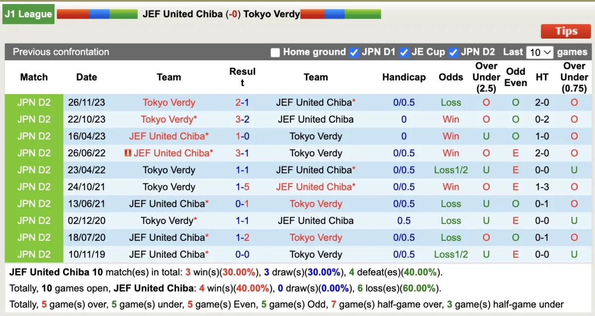 Cần lưu ý rằng trong 4/5 vòng đấu gần nhất, JEF United Chiba đều không vượt qua được kèo Handicap. Trong khi đó, tỷ lệ thắng kèo của Tokyo Verdy đang nằm trong top 3 giải đấu với con số 62.50%, do đó có thể đặt niềm tin vào đội khách trong kèo châu Á.