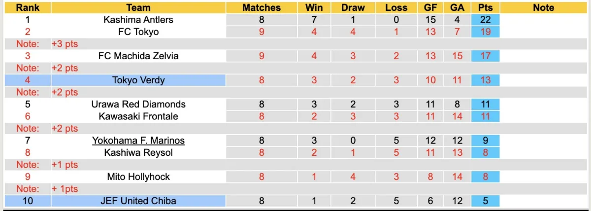 Ngược lại, Tokyo Verdy mùa giải trước đã phải rất chật vật khi chỉ cán đích ở vị trí thứ 17 trên bảng xếp hạng. Dù khởi đầu mùa giải khá thuận lợi với 2 trận thắng, nhưng trong 6 vòng đấu gần đây, họ chỉ giành được 1 chiến thắng.