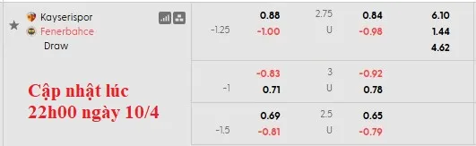 Fenerbahce được nhận định là đội cửa trên với mức chấp lên tới 1 1/4 trong trận này. Mức kèo này cho thấy sự tin tưởng vào đội khách, phản ánh sự vượt trội của họ so với Kayserispor. Đội chủ nhà cũng đã để thua kèo trong 3/4 trận gần nhất tại Super Lig.