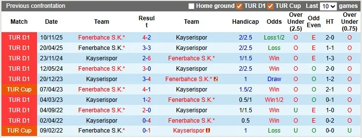 Thống kê phong độ, lịch sử đối đầu của Kayserispor đấu vs Fenerbahce