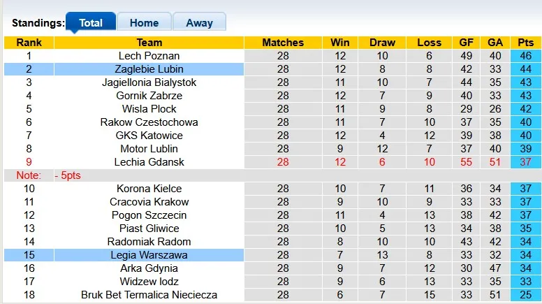 Hiện tại, Legia Warszawa đang đứng ở vị trí thứ 15 trên bảng xếp hạng với 34 điểm. Họ chỉ hơn đội bét bảng 1 điểm, điều này cho thấy khả năng trụ hạng của đội bóng này vẫn đang gặp nhiều khó khăn. Trong khi đó, Zaglebie Lubin vẫn đang trong cuộc đua giành ngôi vô địch.