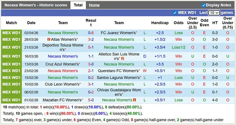 – Thống kê phong độ 10 trận đấu gần nhất của Nữ Necaxa