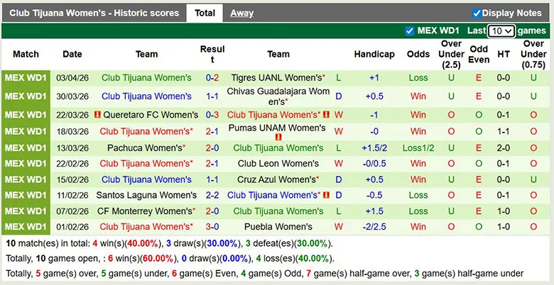 – Thống kê phong độ 10 trận đấu gần nhất của Nữ Club Tijuana