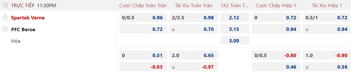 Các cầu thủ Spartak Varna bước vào trận đấu này với thành tích thắng kèo châu Á trong 2 trận liên tiếp gần nhất. Trong khi đó, Beroe chỉ có 1 lần thắng kèo châu Á trong 3 trận đấu trước đó. Tuy nhiên, cần lưu ý rằng Beroe đã thắng kèo châu Á trong cả 3 trận gần đây khi được chấp kèo 1/4 trái như trận này. Thậm chí, trong trận đối đầu gần nhất mà Spartak Varna chấp 1/4 trái, Beroe đã giành chiến thắng.