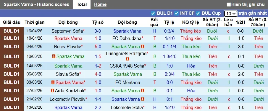 Thống kê phong độ 10 trận đấu gần nhất của Spartak Varna