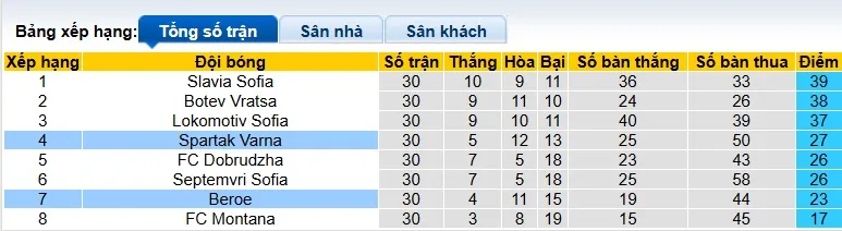Spartak Varna hiện có 27 điểm, đứng thứ 4, trong khi Beroe đang gặp khó khăn hơn khi chỉ có 23 điểm và đang xếp áp chót. Phong độ của Spartak Varna mang lại sự yên tâm cho người hâm mộ với 2 trận gần nhất bất bại, bao gồm 1 chiến thắng và 1 trận hòa. Ngược lại, Beroe chỉ thu về 1 điểm từ 3 trận gần đây.