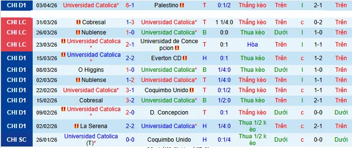 + Univ. Católica đã vượt qua mức chấp +0.25 trong 9/10 trận sân nhà gần nhất của họ.