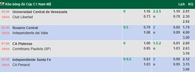 Phân tích trận đấu giữa UC de Venezuela và Club Libertad, diễn ra vào lúc 05h00 ngày 10/4/2026 trong khuôn khổ Cúp C1 Nam Mỹ. Các chuyên gia hàng đầu sẽ đưa ra dự đoán và phân tích tỷ lệ kèo châu Âu cũng như châu Á cho cuộc chạm trán giữa UC de Venezuela và Club Libertad.