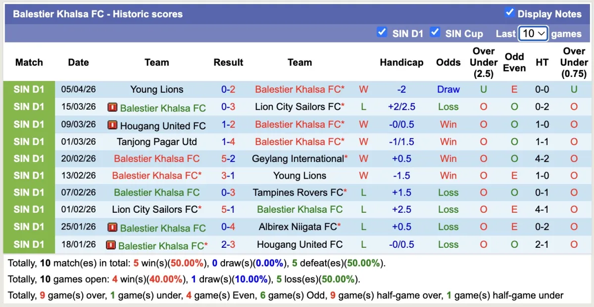 -Thống kê phong độ 10 trận đấu gần nhất của Balestier Khalsa