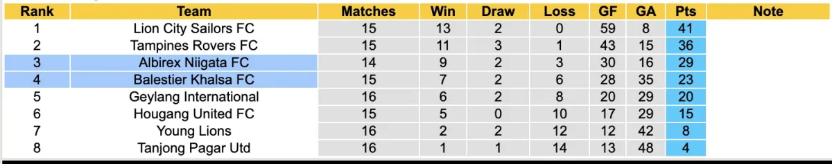 Bảng xếp hạng bóng đá Giải VĐQG Singapore 2026