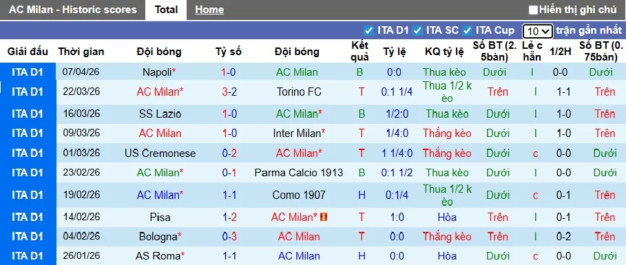 Thống kê phong độ 10 trận đấu gần nhất của AC Milan
