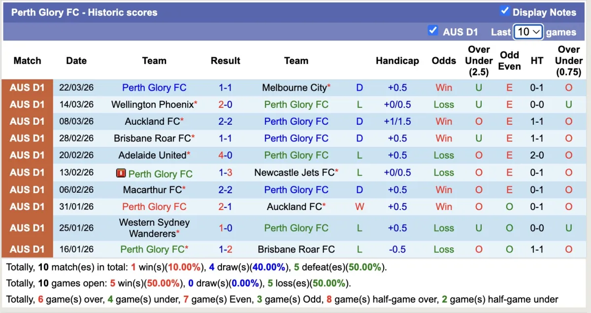 – Thống kê phong độ 10 trận gần nhất của Perth Glory.
