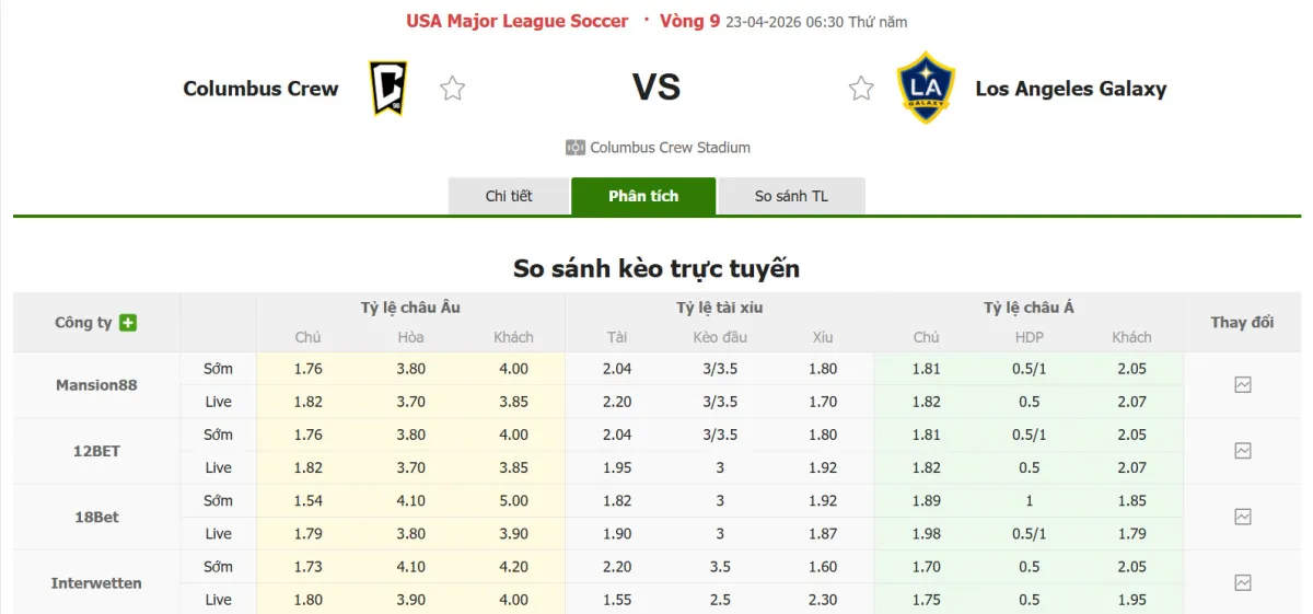 Dự đoán tỷ lệ bóng đá, soi kèo Columbus Crew vs Los Angeles Galaxy