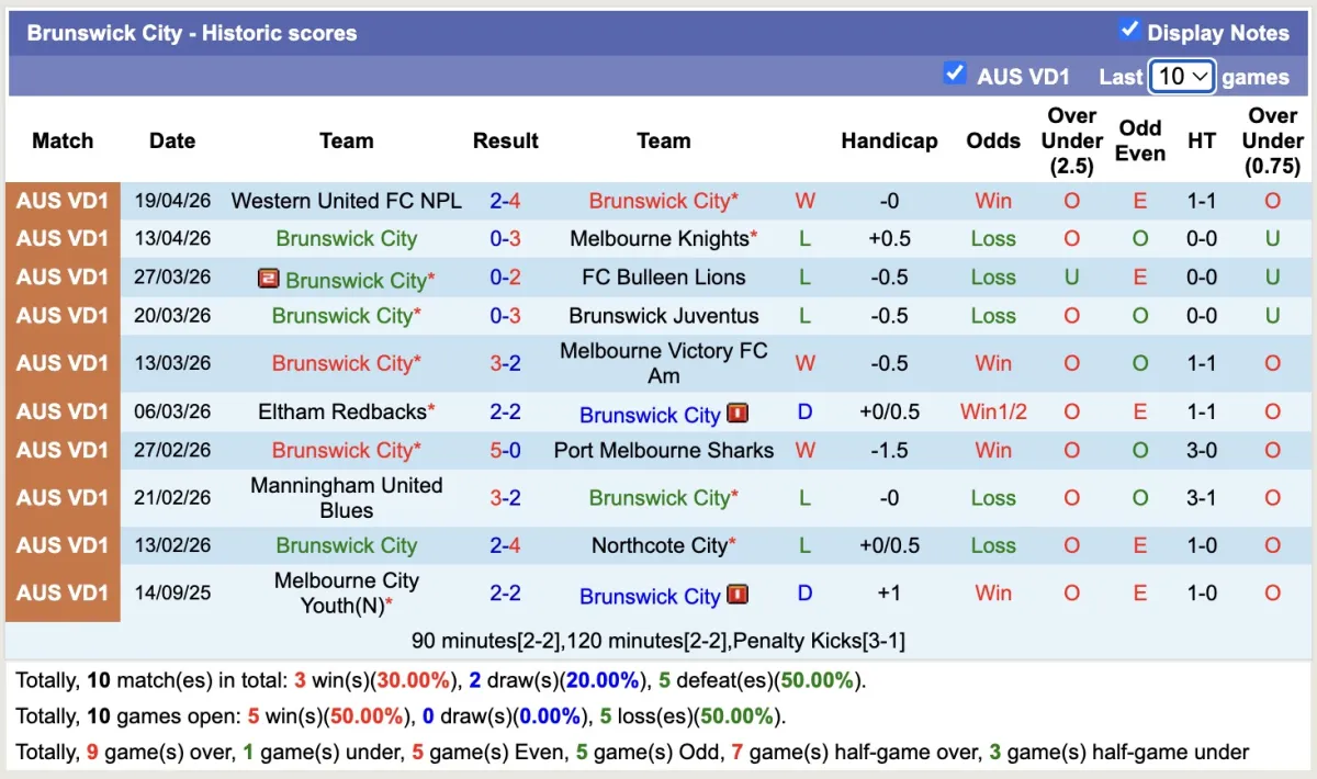 -Thống kê phong độ 10 trận đấu gần nhất của Brunswick City