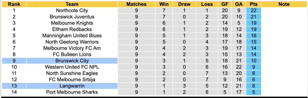 Brunswick City vừa có một chiến thắng ấn tượng với tỷ số 4-2 trước Western United FC NPL. Đây được coi là một sự khởi sắc sau 3 trận thua liên tiếp trước đó. Hiện tại, đội chủ nhà đang hơn Langwarrin 4 điểm.