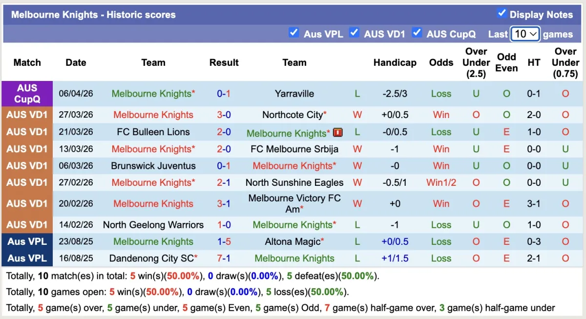 – Thống kê phong độ 10 trận đấu gần nhất của Melbourne Knights