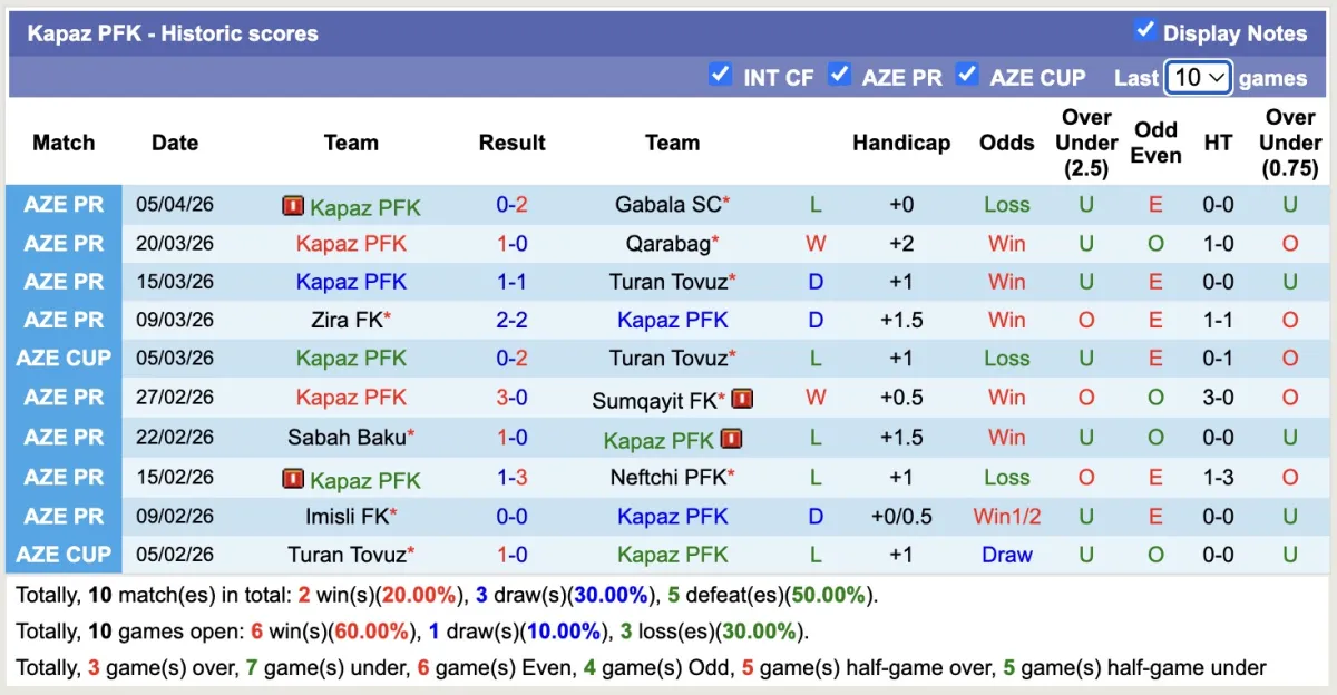 – Thống kê phong độ 10 trận đấu gần nhất của Kapaz PFK