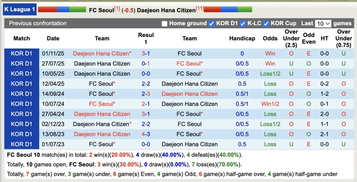 Thật khó để đặt niềm tin vào Daejeon Hana Citizen khi họ đã thua kèo trong 8/9 trận gần đây. Ngược lại, Seoul lại đang có phong độ ấn tượng khi 5/6 trận gần nhất đều thắng kèo. Do đó, khả năng cao đội chủ nhà sẽ là sự lựa chọn đáng tin cậy.