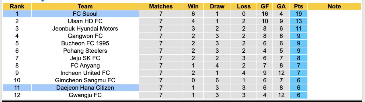 Tình hình của Daejeon Hana Citizen trong mùa giải năm nay có vẻ không khả quan khi chỉ có 1 chiến thắng sau 7 vòng đấu, trong khi đã phải nhận tới 3 thất bại. Hiện tại, họ đang đứng thứ 11 trên bảng xếp hạng và chỉ hơn đội bét bảng về điểm số.
