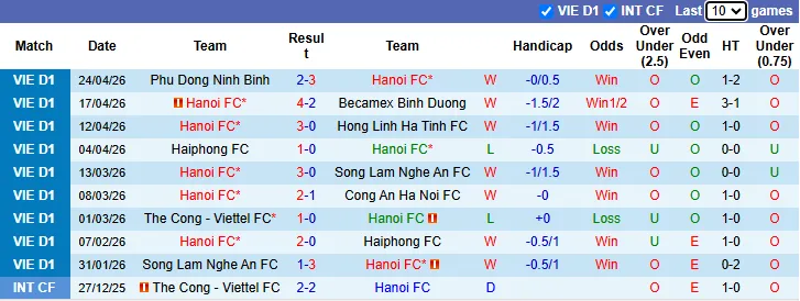 Thống kê phong độ 10 trận gần nhất của Hà Nội
