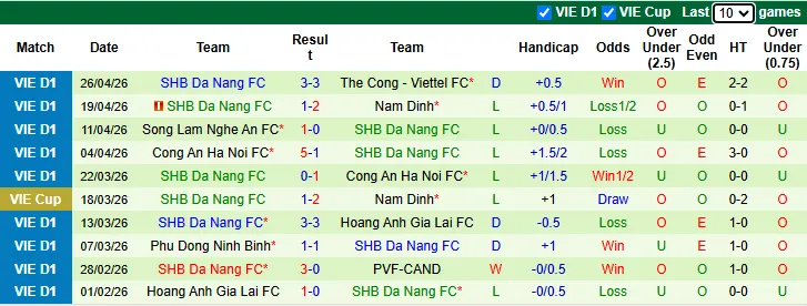 Thống kê phong độ 10 trận gần nhất của Đà Nẵng