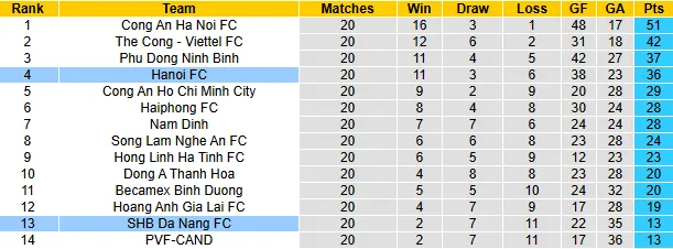 Ngược lại, Đà Nẵng đang đứng ở vị trí áp chót trên bảng xếp hạng V.League với chỉ 13 điểm sau 20 trận, hơn đội bét bảng PVF-CAND chỉ về chỉ số phụ. Mặc dù vừa có một trận hòa kiên cường 3-3 trước Thể Công Viettel để chấm dứt chuỗi thất bại, nhưng đoàn quân của HLV Lê Đức Tuấn vẫn bị đánh giá thấp hơn nhiều so với Hà Nội.