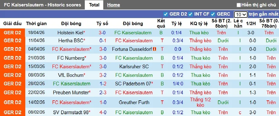 Thống kê phong độ 10 trận đấu gần nhất của Kaiserslautern