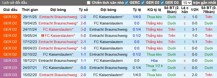 Thống kê phong độ, lịch sử đối đầu của Kaiserslautern vs Eintracht Braunschweig
