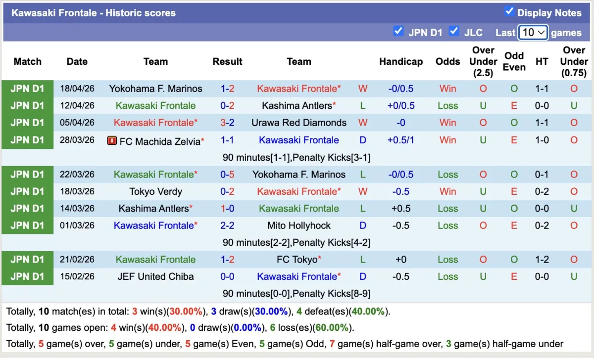 – Thống kê phong độ 10 trận gần nhất của Kawasaki Frontale