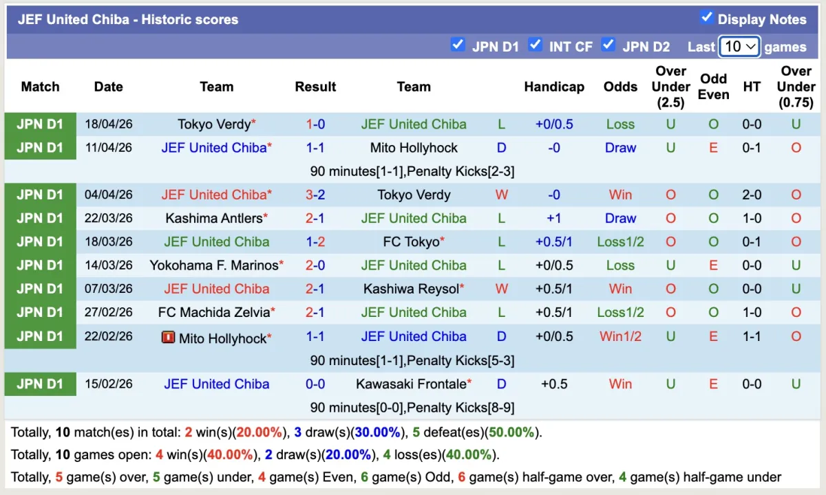 – Thống kê phong độ 10 trận gần nhất của JEF United Chiba