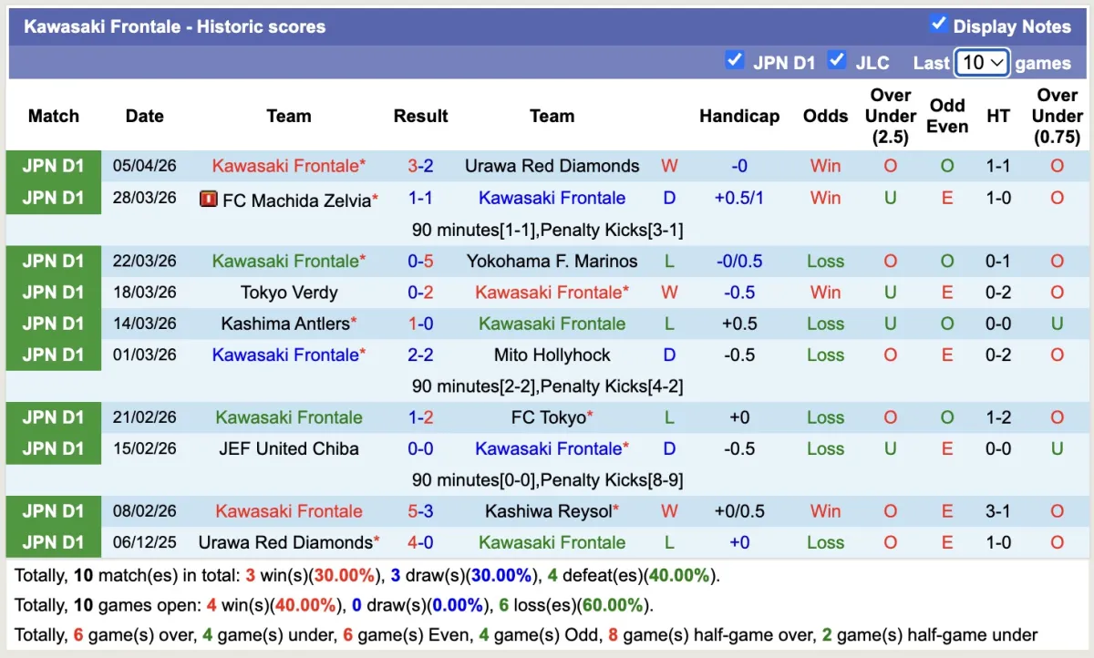 -Thống kê phong độ 10 trận đấu gần nhất của Kawasaki Frontale