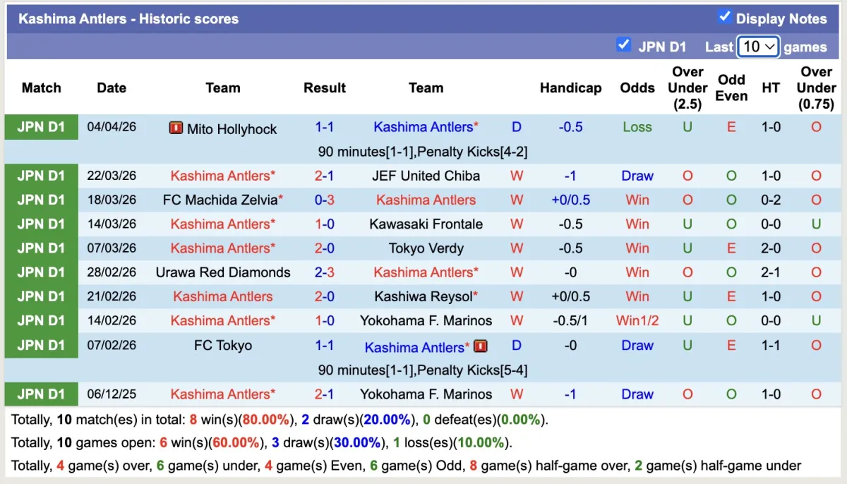 -Thống kê phong độ 10 trận đấu gần nhất của Kashima Antlers