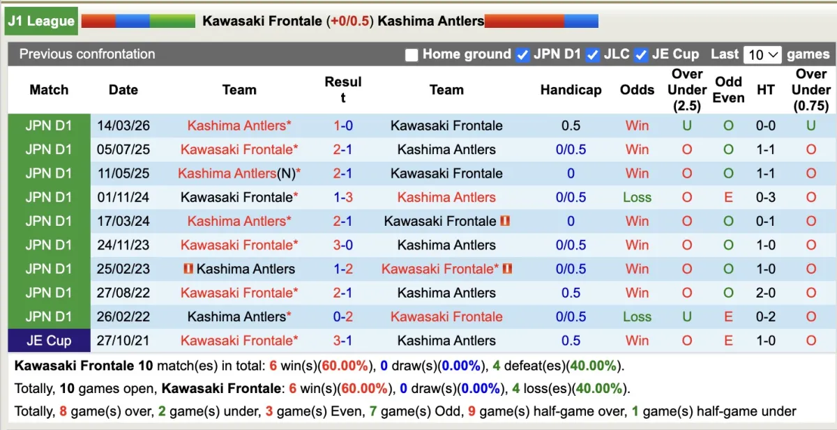 Thống kê phong độ, lịch sử đối đầu của Kawasaki Frontale với Kashima Antlers