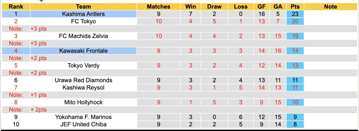 Ở mùa giải trước, Kawasaki Frontale chỉ xếp thứ 8 trên bảng xếp hạng. Sang mùa giải năm nay, đội bóng này vẫn chưa tìm lại được phong độ ổn định khi trải qua 9 trận đấu chỉ giành được 3 chiến thắng và thua 3 trận. Hiện tại, họ đang tạm đứng ở vị trí thứ 4 với 14 điểm.