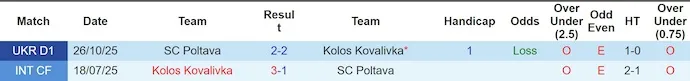 Trong các lần gặp gỡ gần đây, Kolos Kovalivka có phần chiếm ưu thế. Hai đội đã chạm trán nhau 2 lần gần nhất, trong đó Kolos Kovalivka giành 1 chiến thắng và có 1 trận hòa. Trên sân Kolos Stadium, Kolos Kovalivka từng đánh bại Poltava với tỷ số 3-1. Dù vậy, trận đấu đó diễn ra ở cúp và không phản ánh hoàn toàn bối cảnh hiện tại của giải đấu.