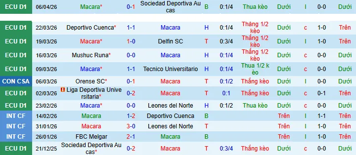 + Macará thắng 12 và chỉ thua 5 trong 17 trận gần đây theo kèo châu Á.