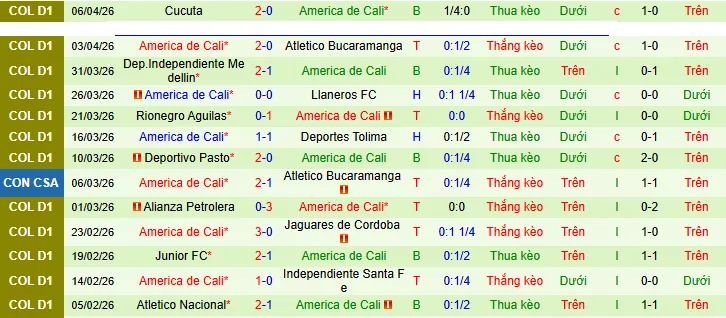 + América de Cali thắng 7, hòa 1 và thua 12 trong 20 trận sân khách gần đây trên mọi đấu trường.
