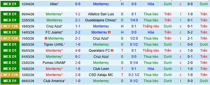 + Monterrey có 1 chiến thắng, 1 hòa và 7 thất bại trong 9 trận gần nhất trên sân nhà theo kèo châu Á.