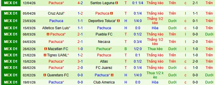 + Pachuca thắng 2, hòa 1 và thua 1 trong 4 trận sân khách gần đây theo kèo châu Á.