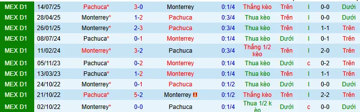 + Monterrey có 3 chiến thắng và 6 thất bại trong 9 trận đối đầu gần nhất với Pachuca theo kèo châu Á.