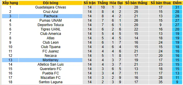 Bảng xếp hạng giải VĐQG Mexico 2025/26