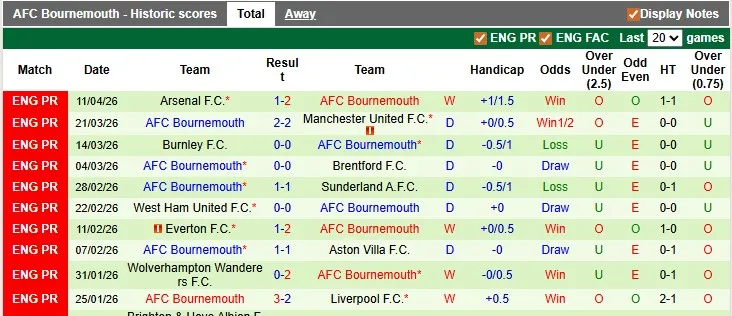 Thống kê phong độ 10 trận đấu gần nhất của Bournemouth