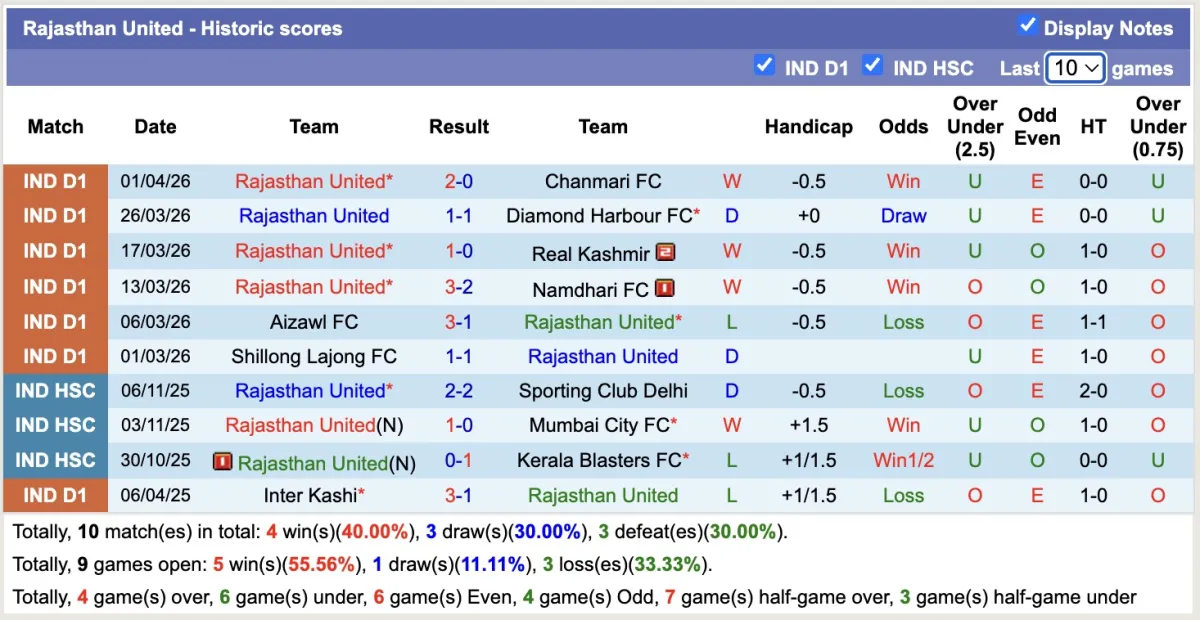 – Thống kê phong độ 10 trận gần nhất của Rajasthan United
