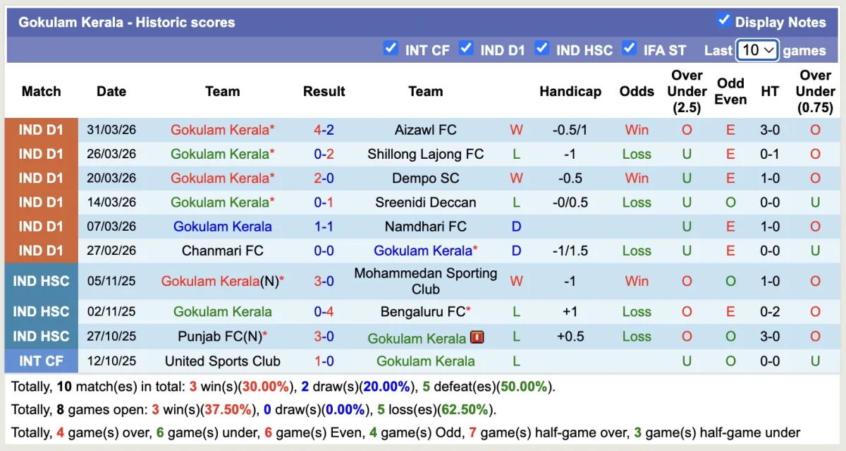 – Thống kê phong độ 10 trận gần nhất của Gokulam Kerala