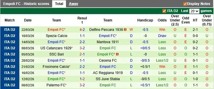 Thống kê phong độ 10 trận đấu gần nhất của Empoli