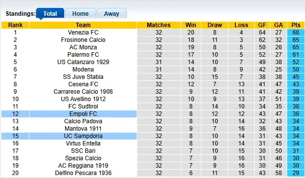 Cụ thể, Sampdoria chỉ hơn nhóm nguy hiểm 4 điểm, trong khi đó họ kém top 6 tới 16 điểm. Càng về cuối mùa giải, phong độ của đội chủ nhà càng trở nên thất thường. Họ chỉ có được 1 trận thắng trong 7 trận gần đây tại Serie B (hòa 2 và thua 4 trận).