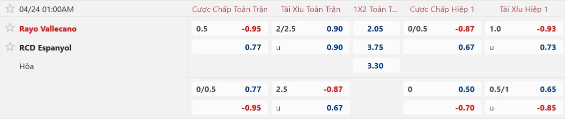 Tại sàn giao dịch châu Á, mức kèo được ghi nhận là Vallecano chấp 1/4 trái, mức kèo mà ở trận đối đầu gần nhất, trên sân nhà họ đã giành chiến thắng tối thiểu trước Espanyol. Hơn nữa, Vallecano cũng đang có phong độ tốt khi toàn thắng kèo châu Á 2 trận liên tiếp gần đây trên sân nhà. Trong khi đó, Espanyol đã thua kèo châu Á 4/5 trận vừa qua.